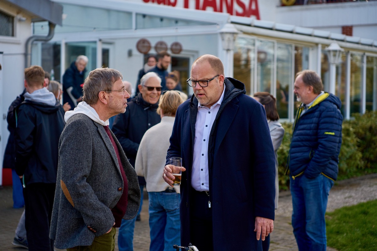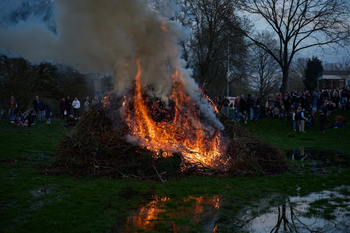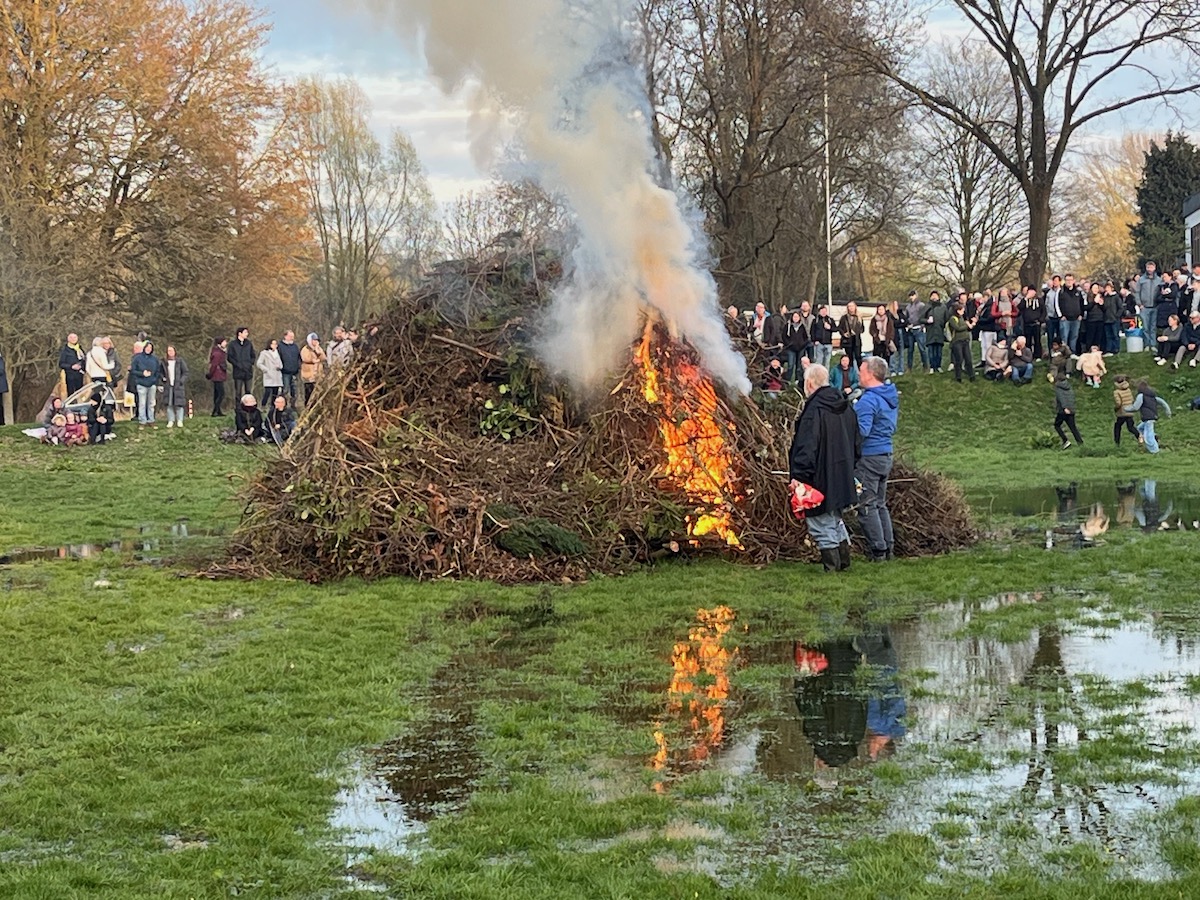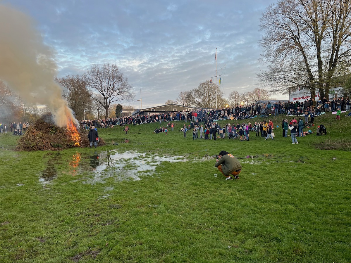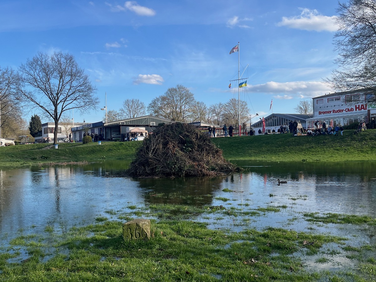 Der vorbereitete Stapel für das Osterfeuer stand zunächst im Wasser. Das Hochwasser lief während der Bootstaufe langsam ab und dann konnte das Feuer etwas später als geplant angezündet werden. Danach brannte es lichterloh.